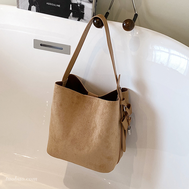 麂皮绒复古磨砂小包包女式2025新款时尚简约单肩斜挎包手提水桶包