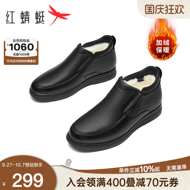 红蜻蜓男士加绒皮鞋冬季一脚蹬男鞋真皮保暖中老年人鞋子爸爸棉鞋