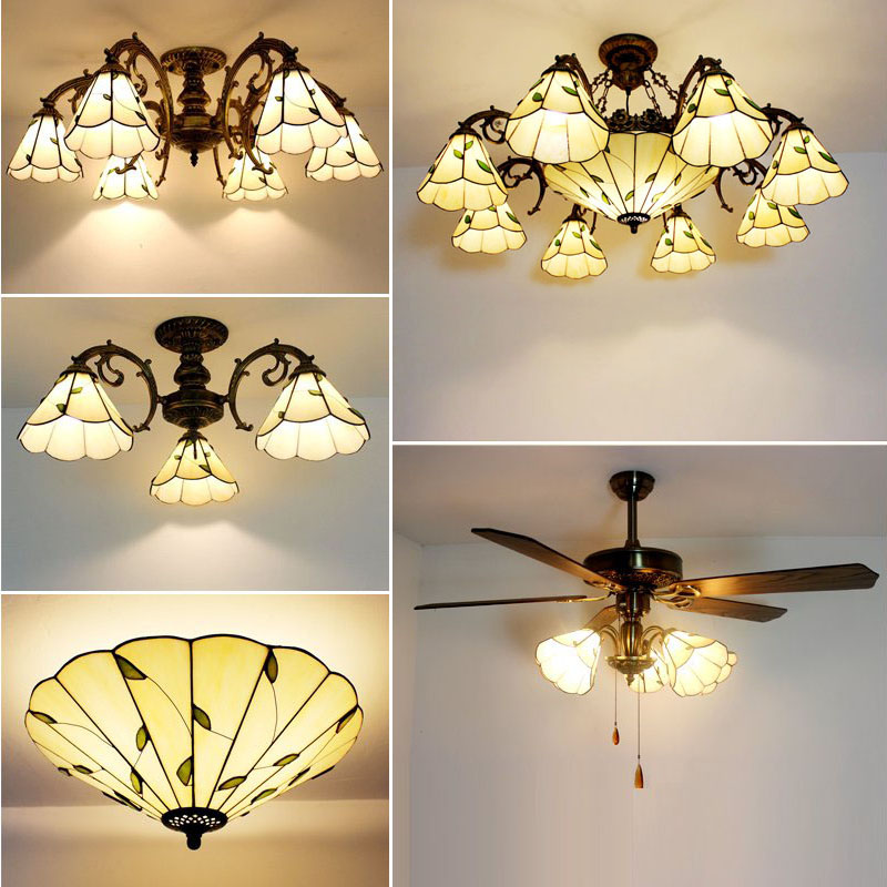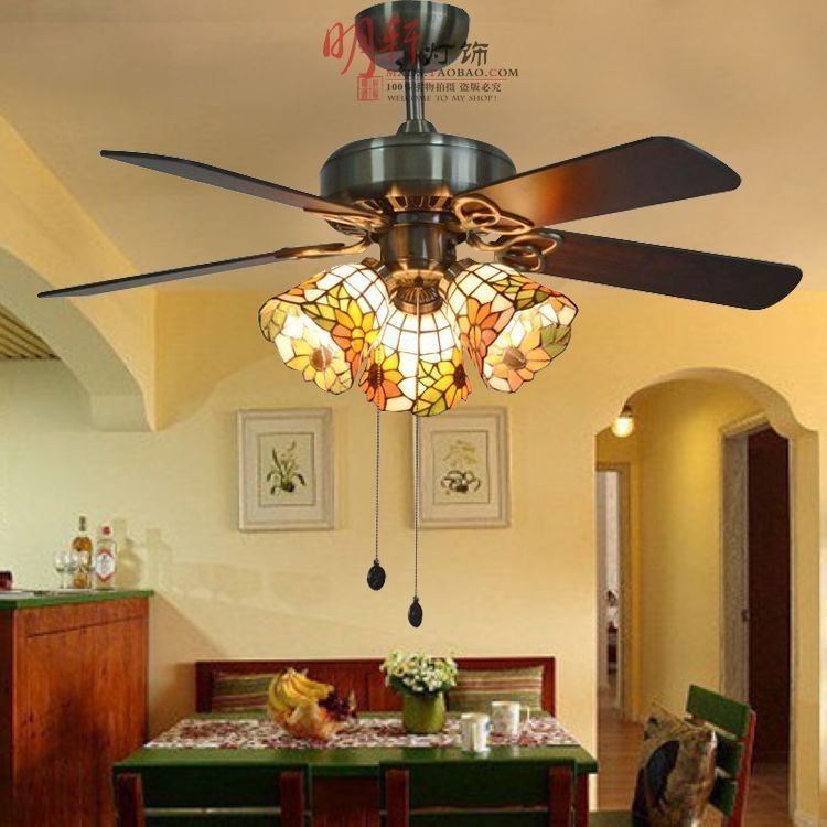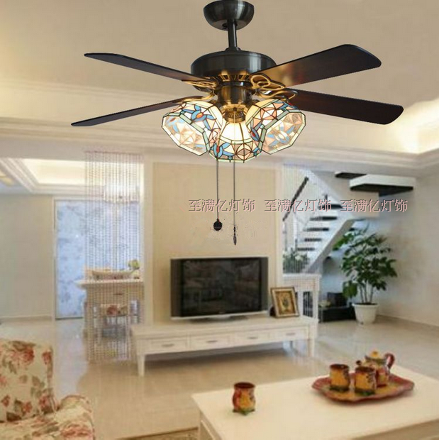 时尚木叶电风扇灯蒂凡尼玻田园餐厅客厅卧室书房欧式仿古风扇吊灯