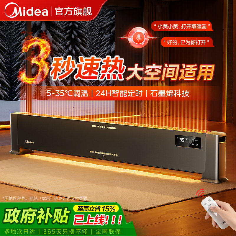美的石墨烯取暖器踢脚线电暖气速热卧室浴室家用语音节能暖风机