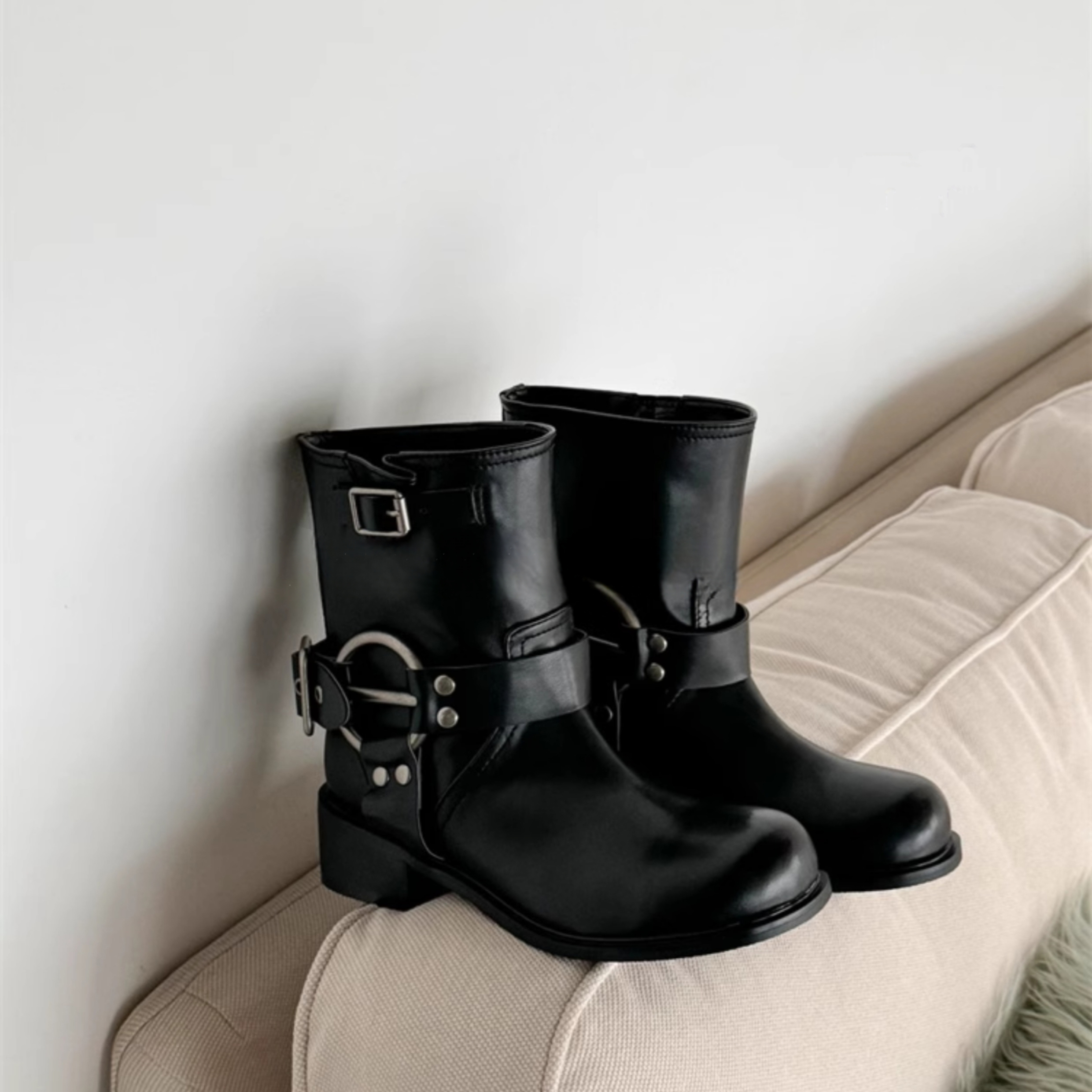 韩国东大门堆堆靴女加绒短靴秋冬复古做旧简约百搭搭扣机车骑士靴