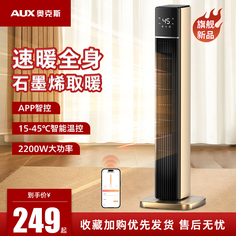 奥克斯暖风机家用节能省电立式石墨烯取暖器浴室速热小太阳电暖器