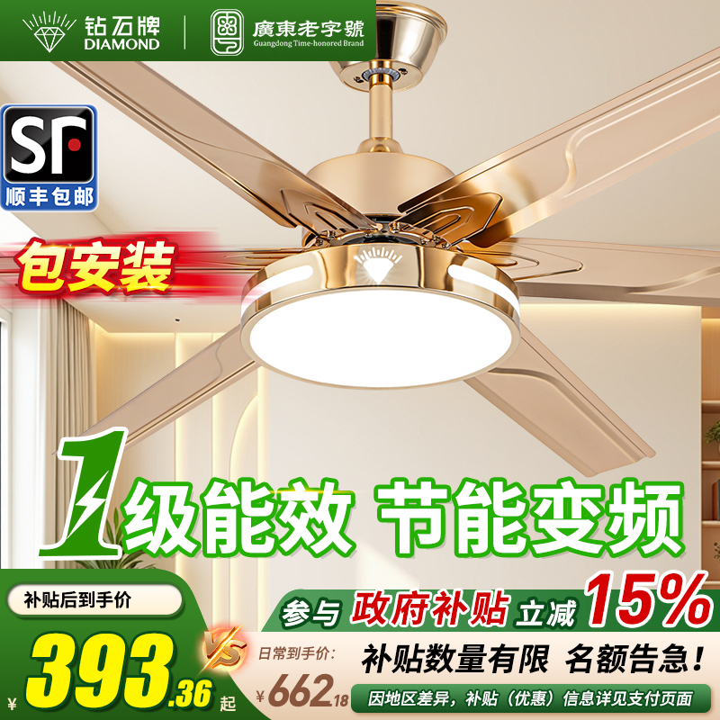 风神不锈钢风扇灯 餐厅吊扇灯客厅电扇灯简约现代LED木叶风扇吊灯