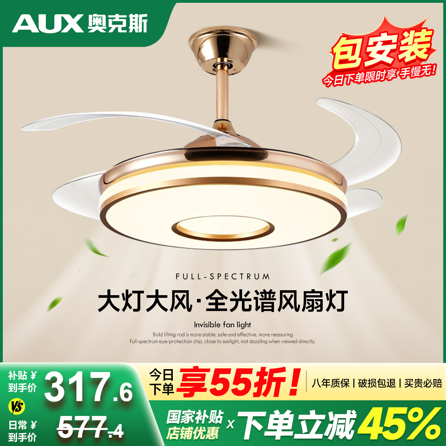 欧普照明客厅餐厅现代简约大尺寸隐形风扇灯吊灯清风全光谱FS