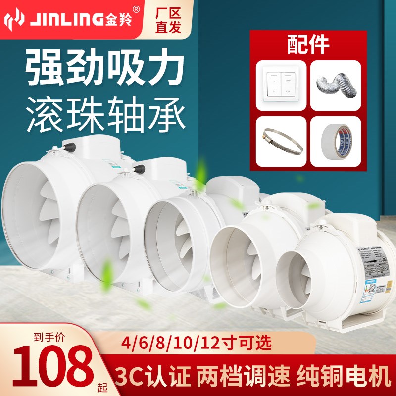 金羚管道风机静音排气扇工业斜流4/6寸厨房油烟家用8抽风强力增压